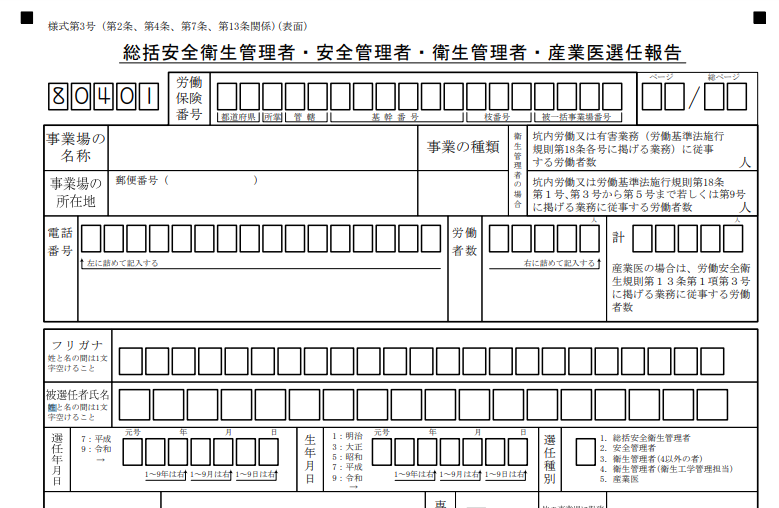 選任すべき事由が発生した日から14日以内に選任し、遅滞なく、様式第3号「総括安全衛生管理者・安全管理者・衛生管理者・産業医選任報告」による報告書を管轄する労働基準監督署に届出なければいけません。