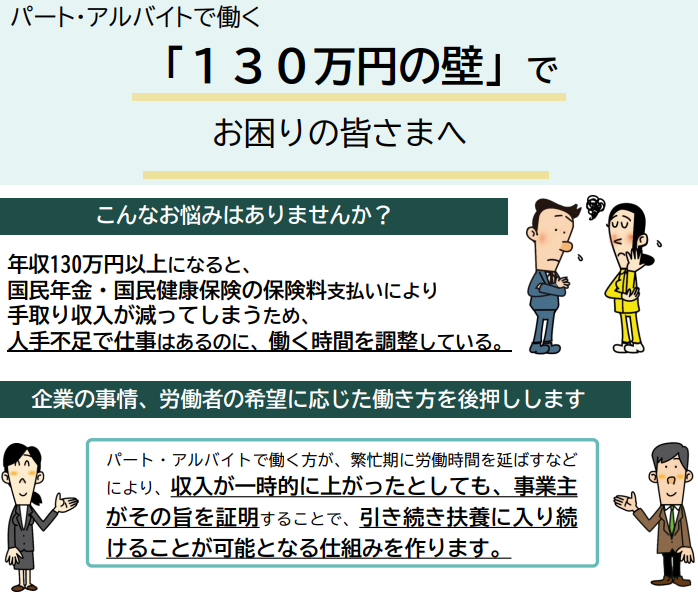 人手不足対応のため、短時間で働く方が「年収の壁」を意識せずに仕事できるような環境を作るための支援策のことです。