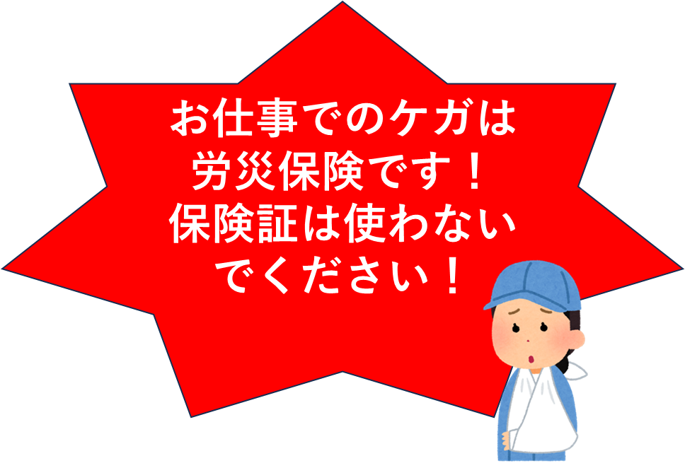 速やかに、事業所へ報告し、保険証は使用せずに労災保険の手続きをしてください!