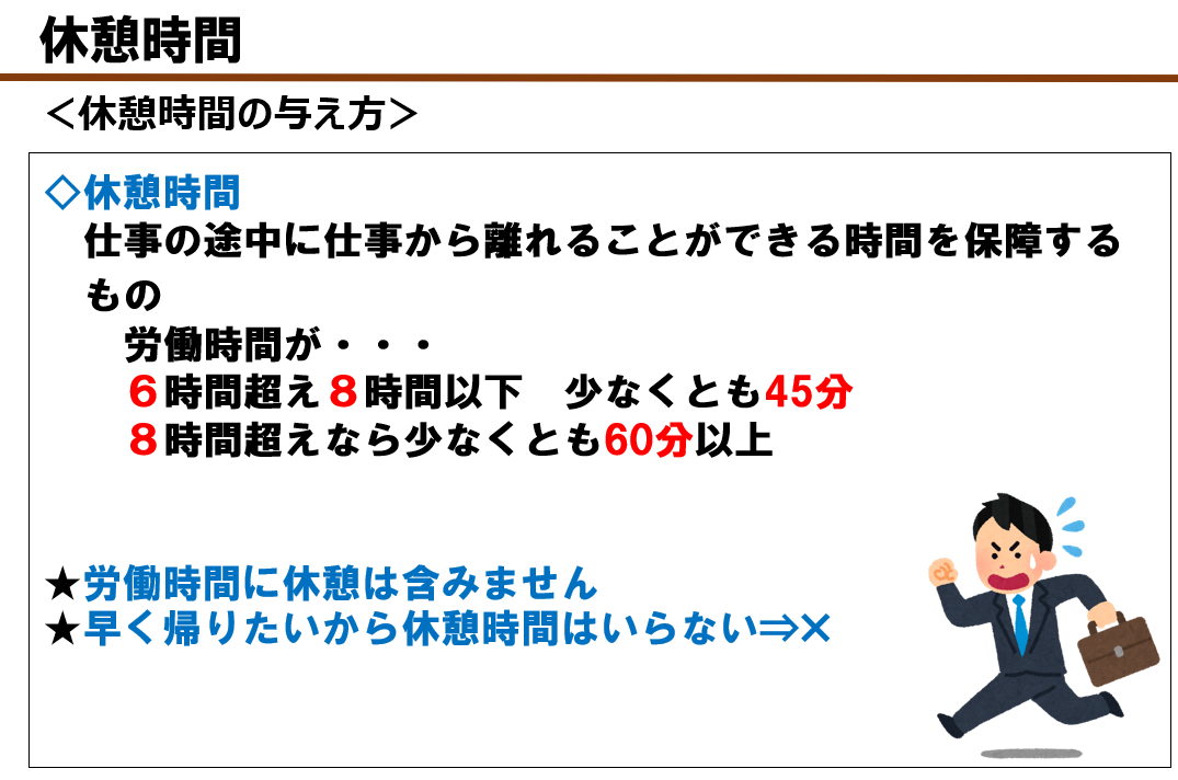 又、労働時間の途中に与えなければなりませんし、労働者が権利として労働から離れることを保障されていなければいけません。