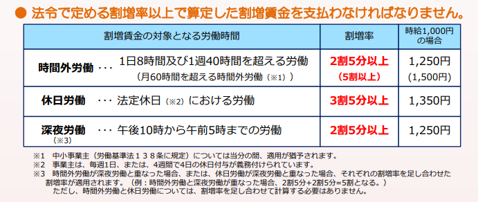 労働基準法では、「時間外労働」「休日労働」「深夜労働」に対し、事業主は通常の賃金より割増された賃金を支払わなければならないと定められています。 (労働基準法第37条)
