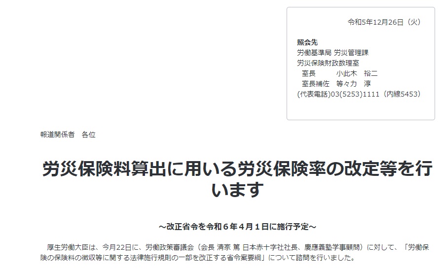 令和5年(2023年)12月26日に開かれた、労働政策審議会により、令和6年度(2024年度)の労災保険料率を業種平均で0.1/1000引き下げる予定となりました。