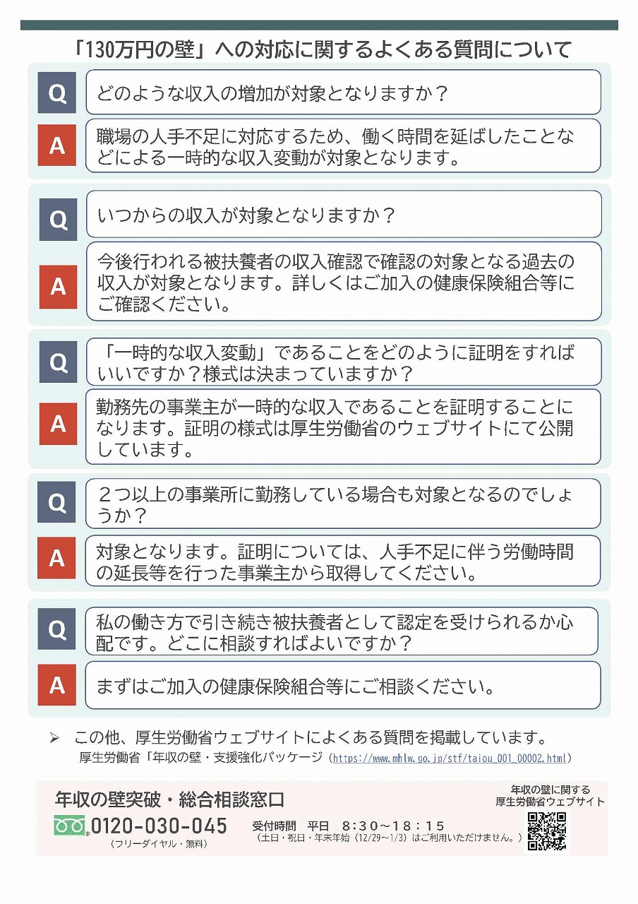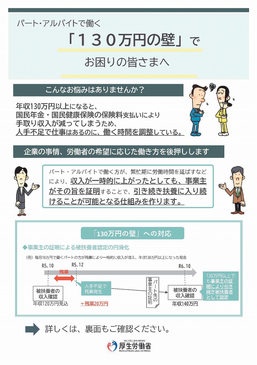 130万円の壁とは、パート・アルバイトで働く人の年収が130万円以上になると、国民年金や国民健康保険料の支払いにより手取り収入が減ってしまうため、働く時間を調整するという社会保険料の壁のことです繁忙期に収入が一時的に上がっても、事業主が証明すれば、引き続き扶養に入り続けられる仕組みを厚生労働省が2023年10月から始めました。※要件があります