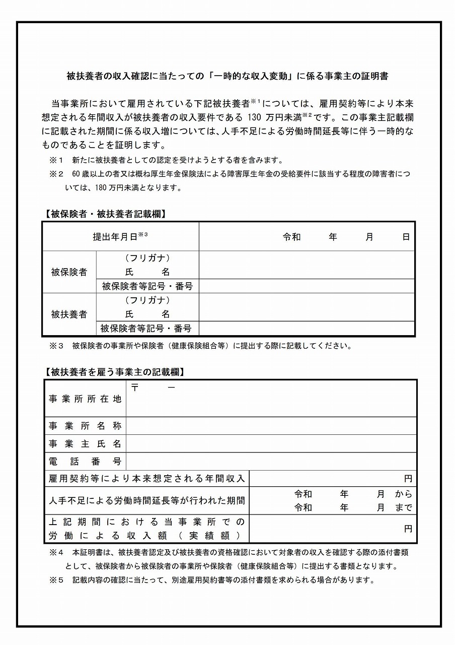 一時的な収入変動に係る事業主の証明書はこちらです↓