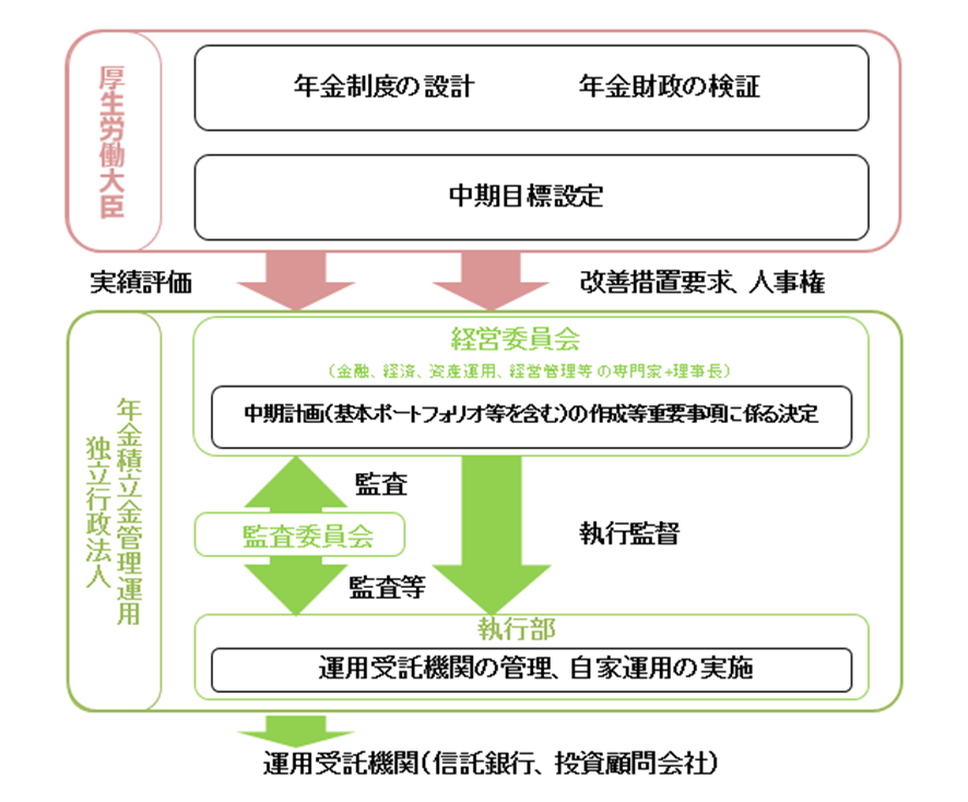 年金積立金の管理、運用は「年金積立管理運用道立行政法人」(GPIF)という独立行政法人が行っており、下記の仕組みで私たちが支払った保険料が運用に回っているようです。