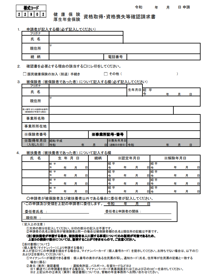 それ以外には、被保険者又は被保険者であった人が日本年金機構へ「健康保険・厚生年金保険資格取得・資格喪失確認通知書請求書」を提出すると「健康保険・厚生年金保険資格取得・資格喪失確認通知書」の交付を受けることができます。