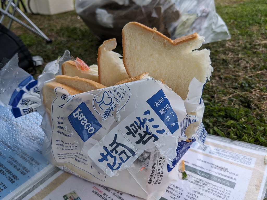 先日キャンプをしたときにタープの下にそのまま置いてあった朝食用の食パンが夜中に野生動物にやられてしまいました💦