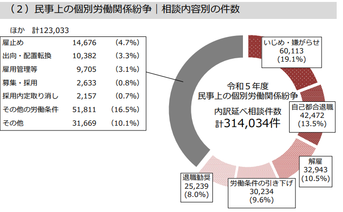 令和5年4月から令和6年3月までの期間、民事上の個別労働関係紛争相談内容については「いじめ・嫌がらせ」が60,113件(19.1%)と昨年に引き続きトップとなりました。