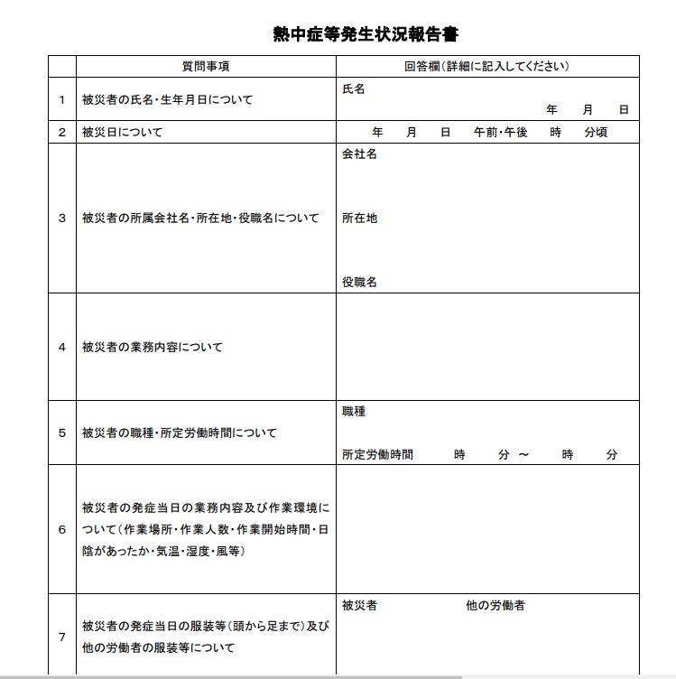 労災申請した場合は、「熱中症等災害状況報告」の書式の提出も必要になります。