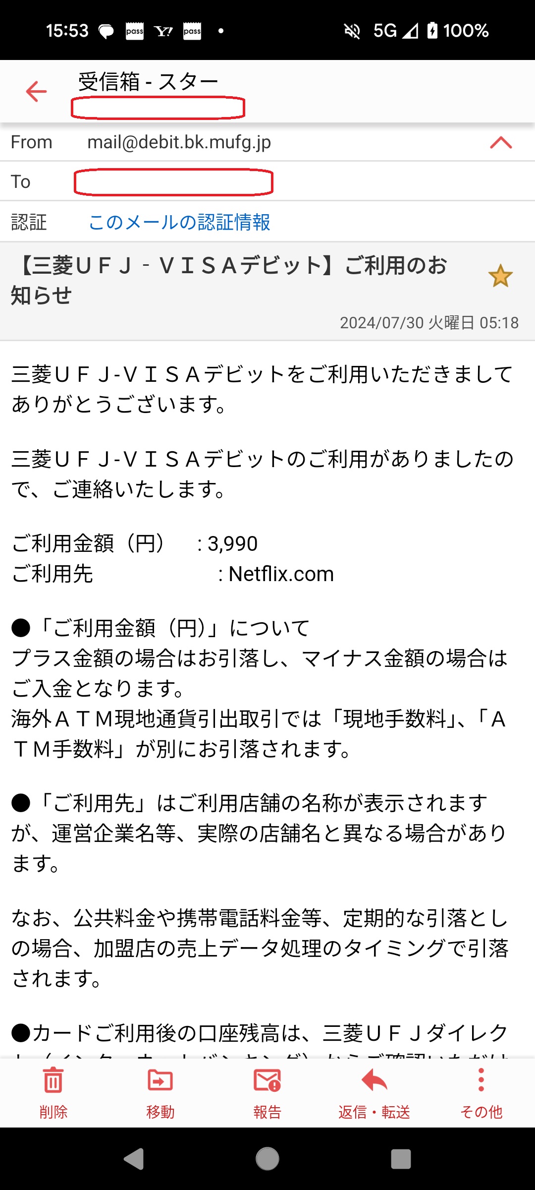 三菱UFJ銀行から送付されたと思わせる件名で、内容は利用金額の連絡でした。