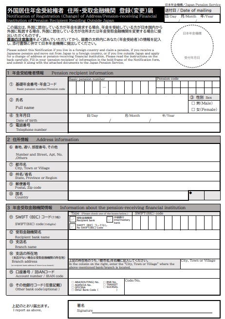 その場合は、「外国居住年金受給権者 住所・受取金融機関 登録(変更)届」を日本年金機構へ提出しなければなりません。